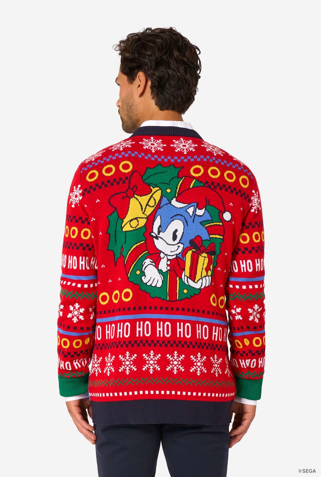 Official knitted Sonic sweater with Sonic and friends, blending retro gaming and festive cheer in one cozy design.
