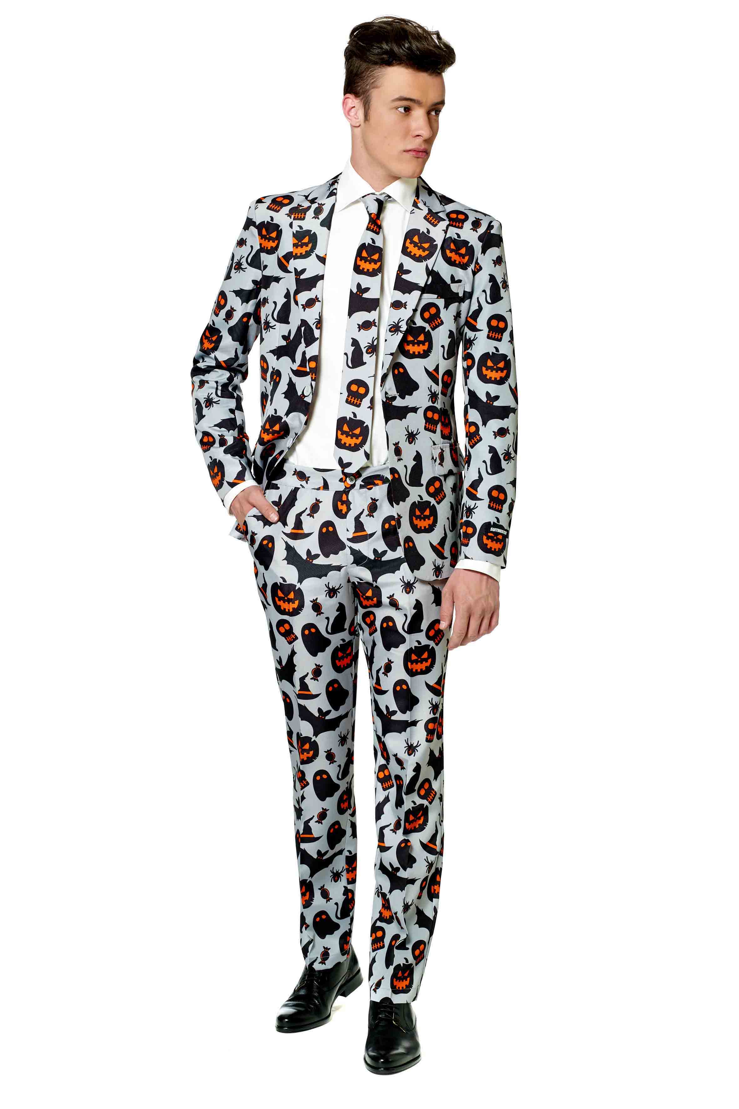 Go spooky in grey with this Halloween-ready printed suit. Includes jacket, trousers and tie.