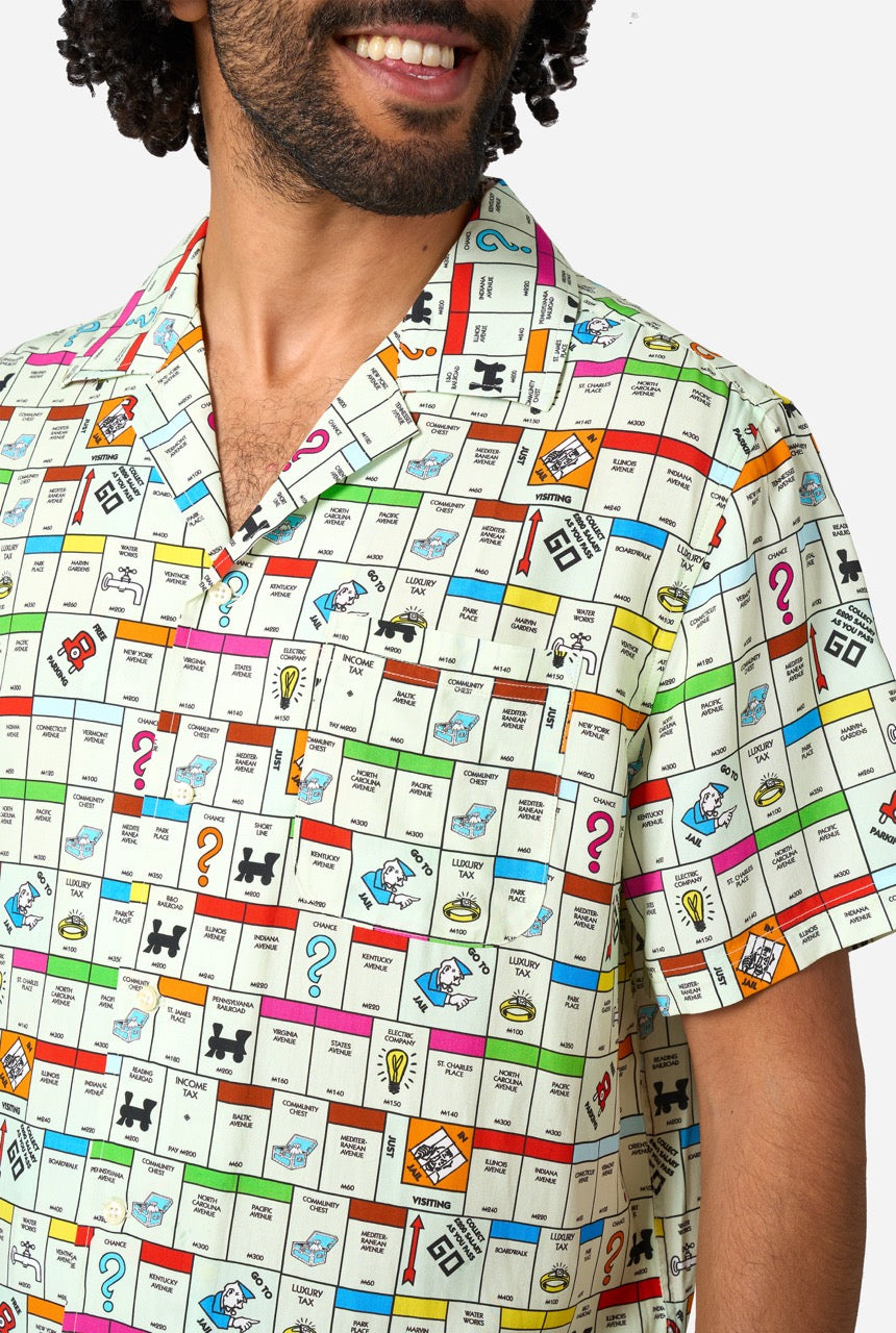 Roll the dice in the Monopoly™ - Board Hawaiian Shirt. This shirt turns one of the most famous board games into a stylish piece, perfect to wear on summer parties or a beach day. Take the first step and turn yourself into Mr. Monopoly.